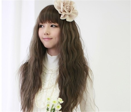浓浓的巧克力色发色,给人以高贵奢华、优雅大气的感觉,长长的波浪卷卷发发丝,散放在肩背,女人味自然流露,再将刘海向上挽起,露出圆润饱满的额头,展示出新娘自信大方的气质。