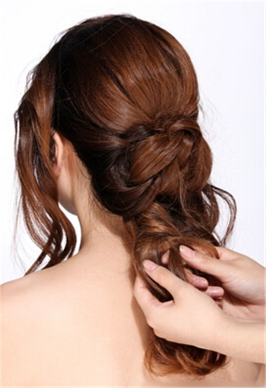 将剩下的头发左右分区,分别利用三股反编发的方法进行编法,然后向中间固定。在这里要切记不要编的太紧哦!在这里小编给大家推荐一下“”,可以帮你打造完美新娘妆,让你拥有较完美的妆容,或者您也可以致电400-099-2169,与我们的客服人员联系!