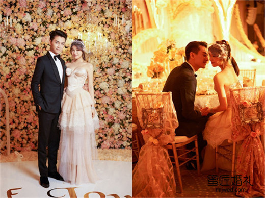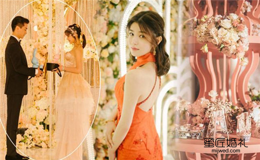 宴席的布置上要侧重豪华与喜庆,大红纱曼背景灯光舞美水晶T台,追光灯泡泡机彩虹机都可以用上,张灯结彩也可以,鲜花堆砌也可以,但尽量红色粉红为主,尽显豪华气派,但是一些过于西式的道具就免了。