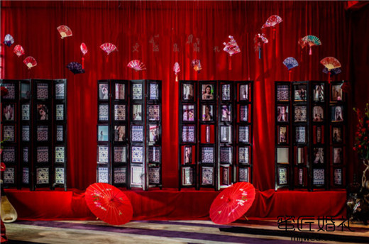 中国的传统婚礼,就应该是红色,而且一定是正红色,在古代红色的婚礼是非常隆重的,哪怕在皇家,也只有皇帝和皇后才可以穿正红色的嫁衣,用正红色布置婚礼.复古的屏风贴满新人的照片,从天而降的纸伞,半壁墙的玫瑰花,从整体来看,婚礼很有层次.也适合来宾们合影。