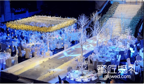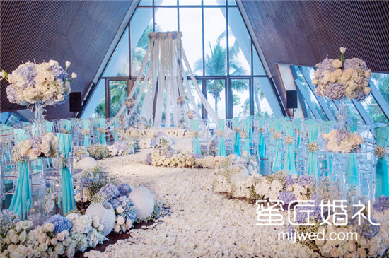在国内很多婚礼仪式还是更多选择在酒店内,在舞台上可以搭建一个室内婚礼仪式亭。用白色帷幔布半圆围绕起来,摆上主持台,增添热带绿色植被的装饰,也有番户外浪漫气息。