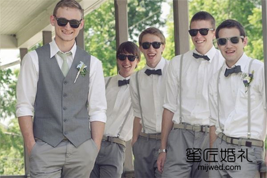 如果觉得穿白色短袖衬衫,新人们觉得不够正式。那么在炎热夏季,男方接亲时候也可以脱下西装礼服外套,单独穿着里面白色西装衬衫。再配上西装背带裤,简直萌倒伴娘团们。马上对你放行哦!