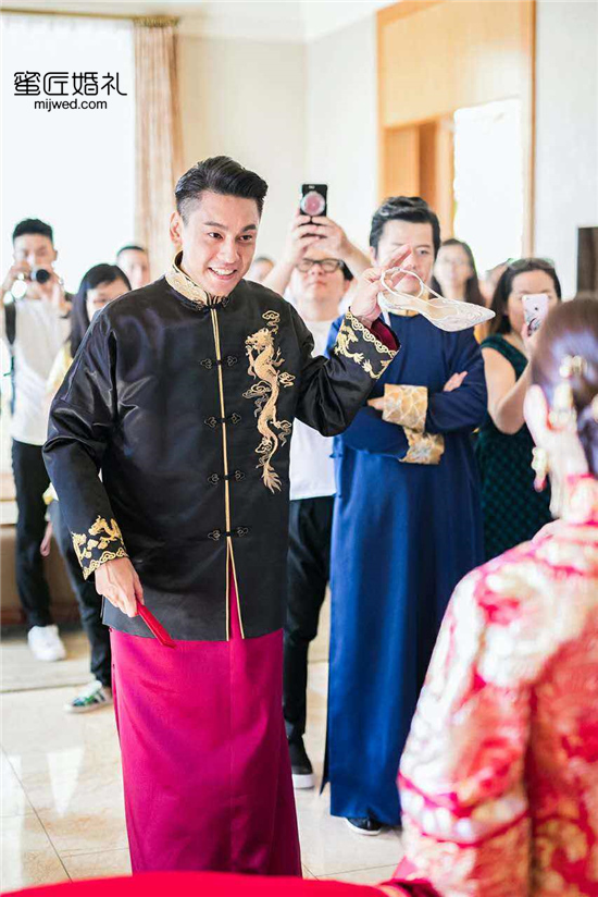 如果新人们举行的是中式婚礼,新娘穿着是秀禾服或者龙凤褂。那么男方去接亲时候也穿上中式礼服比较好。像男士秀禾服和唐装都是较佳的选择。比起西装礼服能增添中式婚礼氛围,更有感觉。