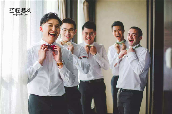 如果是在夏天时候举行婚礼准新人。男方接亲穿什么,为了不让准新郎穿上西装套装热晕。较好选择就是白色短袖衬衫,在配带一个领结。非常有新郎的feel,还俏皮阳光。在玩堵门游戏时候也能大展拳脚哦。