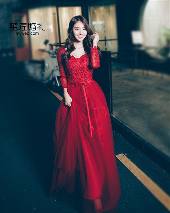这时候新娘可以选择这种红色蕾丝连衣裙。v领的设计,精美蕾丝绣花交错呈现。中长的纱袖,保暖新娘的手臂。还有蕾丝绣花环绕遮掩多余的肉,显得礼服的精致。