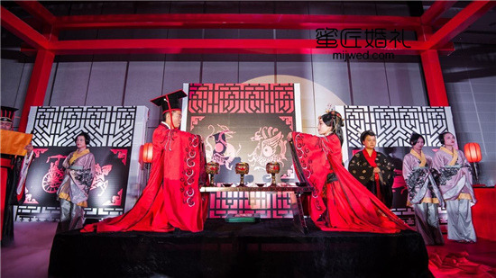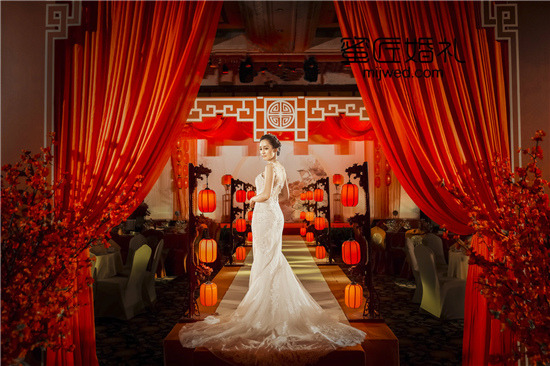 其实现在会流行中式婚礼热,主要还源于婚礼形式更新,衍生出了新中式婚礼。像蜜匠婚礼打造的中国风就是典型新中式婚礼主题。婚礼场地的布置运用的主色调为红色,还用书画锦缎、帷帐纸伞、精细的流苏和秀丽的灯笼,都完整的表现出中国的传统文化美。