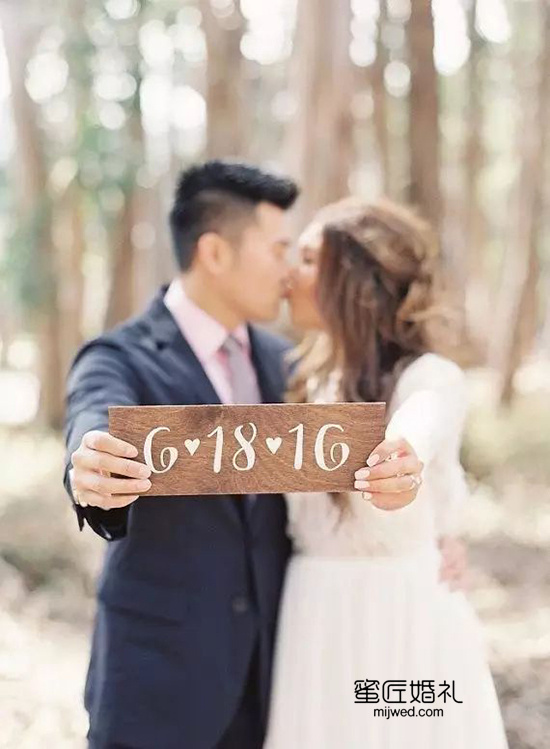 还有非常有文艺气息的木板,可以两个人深情对望,把板子对着镜头。成本也很低,而且对所有风格的婚纱照都适用。不论是气球、木板还是其他细节小物,拿着木板的照片既有创意,还能记下属于你两的记忆。婚礼日期也是一样,记录下这个只属于你们俩的日子很有意义。