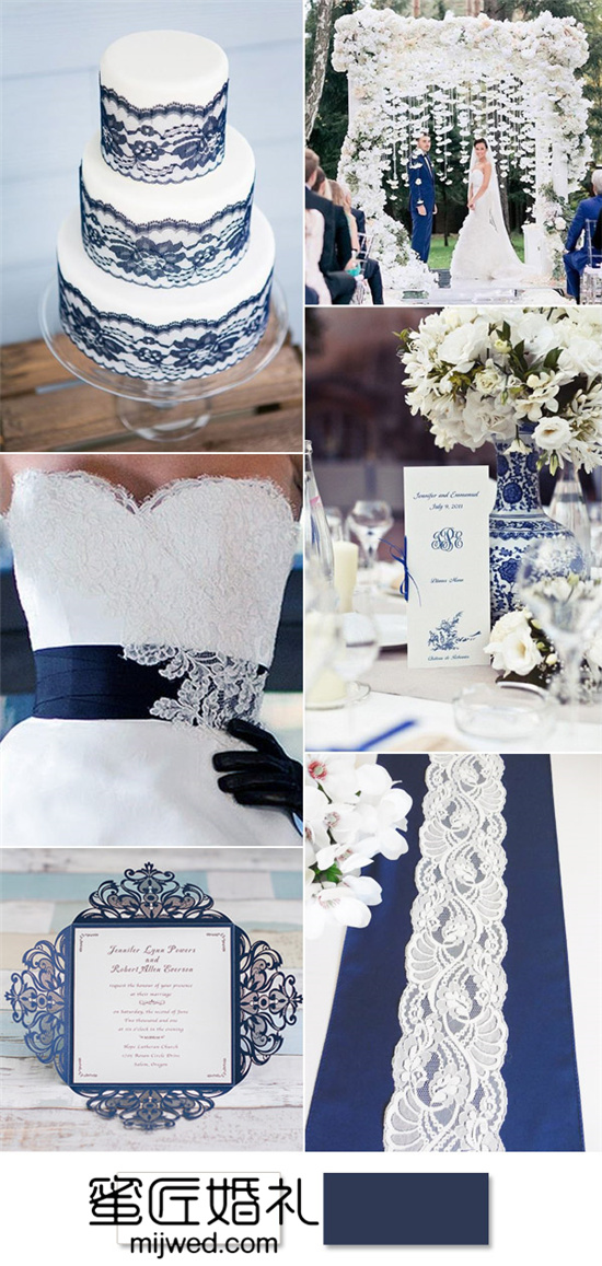 如果您觉得这个蕾丝婚礼创意布置有点太过普通,那可以运用您喜欢色彩放在里面。蜜匠婚礼小编较近非常迷宝蓝色,我们可以把宝蓝色、白色、蕾丝进行结婚。