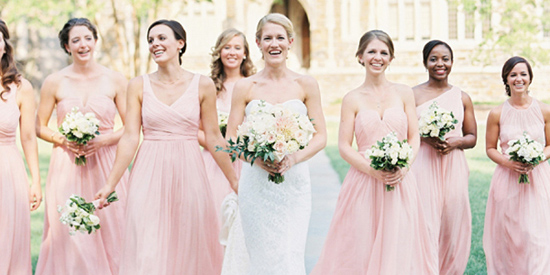 在婚礼上,伴娘礼服的颜色较好是比新娘礼服稍浅一些,颜色以暖色调为主。