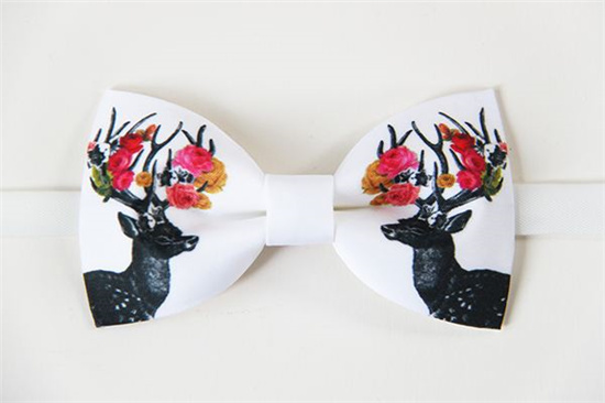 印花领结一般新郎都会觉得比较花哨,但是搭配得宜也会极致有型,而且撞衫的机率非常低,想要力求独一无二的新郎可以试试这种搭配。印花领结加上纯色白色衬衫是新郎领结与衬衫搭配的经典搭配。