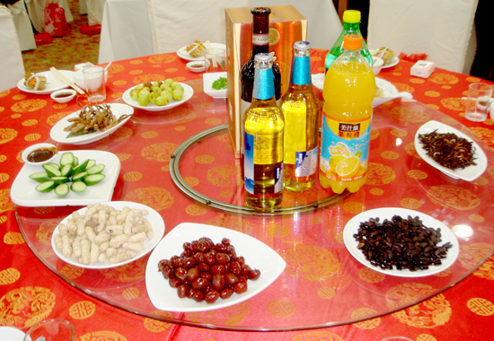 在上菜前一小时准备摆酒水茶水、喜糖、香烟、干果等,并且她们的摆放位置及朝向要统一。