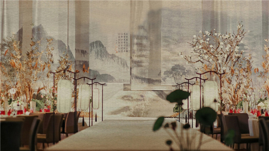 像这种中式古风的淡雅婚礼主题,配上洁白的婚纱也是充满圣洁感。泛黄的古墨山水布景打底,数幅黛色山水绢画悬挂于舞台上,娟秀小楷题跋,舞台两侧是一丛秋日草木,荷叶已然卷边,朵朵莲蓬甚是惹人,一株娇俏的玉荷开得正盛,一把绘有夏荷红蜻蜓的油纸伞立在一旁,仿若伉俪赏雨暂歇凉亭。迎宾区是晓月初升的背景,左侧朵朵荷花玉兰交错开放,右侧三架素白屏风掩映在花叶中。签到区浓墨绘出的迤逦山水在错落的屏风上蔓延开来,婚礼满室清雅古韵,才子佳人喜结连理。