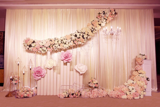主舞台:雪紡布缦(7*3M 1套)、优质舞台包白(1套)、纯手工大花(11朵)、精致钻石灯(4盏)、花瓶加花 (1组)、白色管艺管风琴造型(1组)、亚克力半球加花装饰(2组)、白色铁艺方框加花艺(1组)、挂满水晶珠链和羽毛 树艺(1棵) 、方框花艺加水晶珠链(1组)。