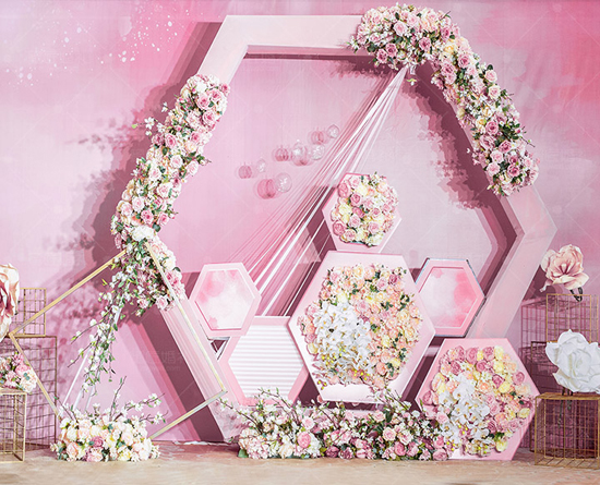 BABY粉:如果你还是一个怀着少女梦的姑娘,那这款粉红色的BABY粉就一定不能错过了。蜂巢造型外加金属钻石造型,打造不一样的粉色甜蜜,活泼浪漫就像那个少女一直在等待着她的白马王子的到来。整场婚礼我们引入较新设计风潮LowPoly元素,加入拼接的蜂巢创意造型、金属质的钻石造型,同时配以缤纷的仿真花艺装饰、婴儿肌肤般的柔光效果,美学线条与螺旋花艺在虚与实的场景中穿梭,高度渲染甜蜜的粉色氛围,营造无尽的温馨与暖意。