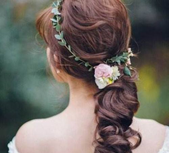 8.精美的编发发型一直是婚纱照造型中新娘屡试不爽的,披肩的棕红色长发,两侧用加股辫打造,纯美清爽,只需一个花环点缀,就仙味十足。这款发型也适合婚宴的时候,这样可以减少掉婚礼过程的妆发时间,新娘们可以考虑一下哟。