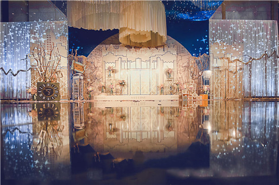 香槟色底纹的KT板纡回裁剪,勾勒出城市城市的轮廓,一轮同色明月在舞台上露出半张娇颜,轻柔的白纱再舞台上微微摇晃,绰约的清影映在城市楼宇间,暖黄的灯光轻柔的在洒落在舞台上,宛如月光轻抚万家灯火,仪式通道采用管风琴原色的设计,金色的圆管并排而立,端庄而秀丽。迎宾区以一片深蓝色的星空为背景,城市轮廓布景安静的立在半圆地图前。有如仲夏夜之梦,两旁是几何框架和几株古树,夜幕已悄悄攀上枝头,星光摇曳,每一颗都闪烁着深情。万家灯火,漫天繁星,都如我对你的爱,永无穷尽。