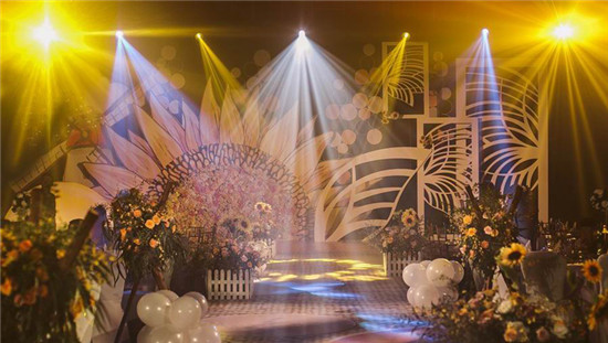 这是一场别具匠心的秋日婚礼,桔蓝两种撞色系灯光充斥全场,叫人一霎便移不开眼睛,无数向日葵将这场婚礼变得温馨俏皮,就像是走进栽满向日葵的后花园,葵花迎着夕阳肆意绽放,笑意染上眉梢。夜色初上,舞台以无数星星灯兜顶,一片繁星闪烁,你我时光正好,何不身披初秋微光,趁此一游?迎宾区柠檬的点缀就像秋日里暖心的柠檬红茶,清爽怡人,美的冒泡,置上一杯茶饮,带上你送的老花镜,午后的悠闲时光就在报纸的字里行间悄悄溜走,美好悠然。