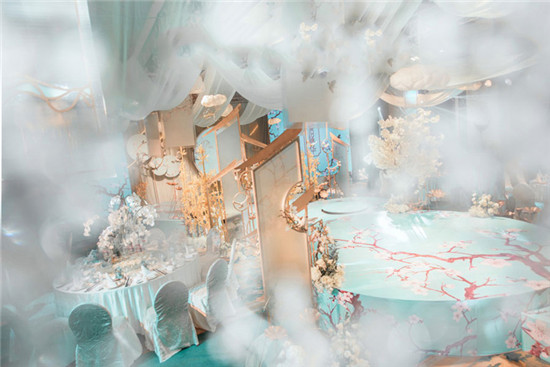 “水是西湖,云是天,踏遍红尘路,结伴水云间”琼瑶的诗用来描述这场婚礼再合适不过了。整场婚礼铺满了淡淡的水蓝色,像是温婉的江南美人,一颦一笑间皆是似水柔情。半侧楼阁造型的亚克力景片立于两侧,亦是一道亮色,桃枝盛开的仪式通道,好似水乡柔情,湖面波光粼粼。主舞台青山远黛,圆形背景上,佳人倩影,婷婷袅袅;金色荷花铁艺造型零星错落散布,映衬着水蓝色的纱幔背景,一幅仙子游湖的画卷就此展现在众人面前。迎宾区金竹林立,木质屏风折于一旁,几支梨花枝破窗而入,美艳动人。