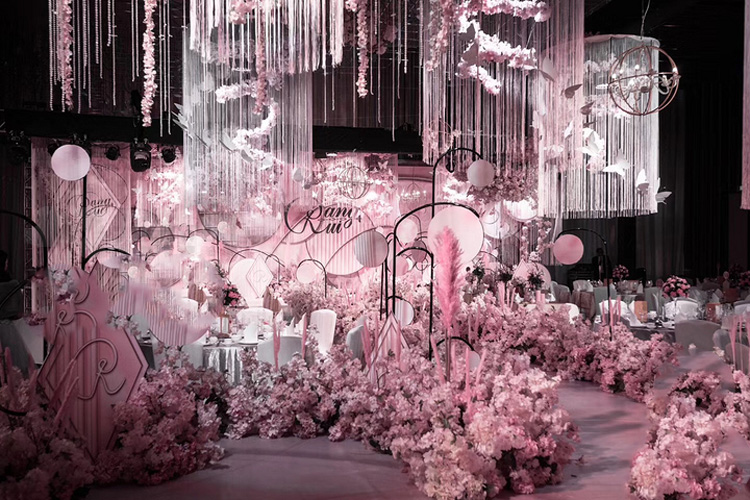 婚礼选用ins粉作为婚礼主色调,粉色的圆形KT板搭配黑色的铁艺造型作为主体,打造甜蜜时尚质感。主舞台悬挂有数盏球形铁艺水晶灯和几盏线帘,白色的蝴蝶穿梭其中,梦幻而浪漫。仪式通道的路引采选用了路灯灯牌的造型设计,象征着新人携手走过的旅程,当路灯一盏一盏的往后退入时光里,新人来到幸福的舞台,这不是终点,这是幸福的起点。人生是一场旅行,较幸运的不过就是微雨时分的某个路口,在某盏路灯下遇见某一个人,从此有TA陪你走过春夏秋冬,陪你走到雨过天晴。