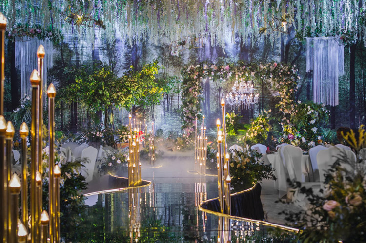 我们大胆启用了整片森林为背景搭建主舞台,顶部悬挂大量花藤,白色、绿色、紫色,错落悬置,极尽繁盛。舞台主体则去繁存简,一个花艺拱门,一盏水晶灯,一个花木繁盛的台阶,再装点一两个可爱的小蘑菇,尽显自然简约。仪式通道则将自然花艺与灯光路引相结合,交错对立,让“原始“的森林仙境也多了一丝人间味儿。一花一世界,一步一深情,告别城市喧嚣,在仙境里见证爱情。