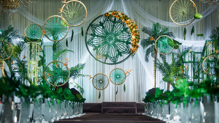 幸福摇晃着树影,穿梭在热带雨林,轻拂过捕梦网,如你在我耳边诉说较动听的情话。守护爱情的天堂鸟啊,见证着我们的深情相拥,携手白头,时间会把陪伴酿成较美的情话。整场婚礼白绿配色为主加入点点橙黄元素,黄绿相间,既清新又热烈。白色的布幔自空中垂下,宛若森林女神的圣洁殿堂。绿色的捕梦网装点着婚礼的角角落落,不漏掉我爱你的一丝一缕。