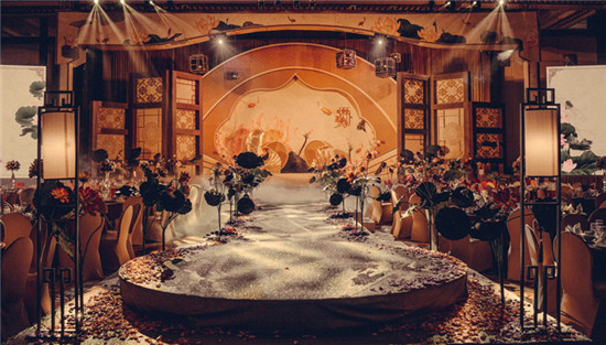 红花梨色的屏风徐徐拉开,一幅出水芙蓉图尽显眼前。几扇油纸伞撑开而立,是谁在这荷花池边等待了上千年,只为了一览这芙蓉风采。两侧笔墨晕染,青荷亭亭玉立。仪式通道上莲荷摇曳,正如那句“叶子底下是脉脉的流水”,花瓣满地,灯光下波光粼粼,在这场婚礼中更加闪烁,荡漾了人心。迎宾区马头墙上金鱼嬉戏,新人两姓并立成印,墙角是大片的荷花丛,墙头是缥缈的祥云,岁月静好。