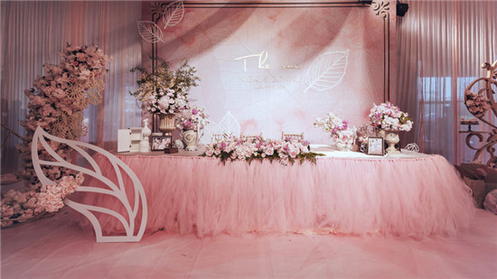 一般婚庆提供香槟台、蛋糕台铺布幔,交杯酒杯、蛋糕刀、点火棒用鲜花装饰。针对于一些比较小的舞台,无法搭建香槟塔的,也可以使用LOVE荧光香槟板。别看这些小东西,对于舞台整体布置上,也可以起到画龙点睛的作用。香槟塔和蛋糕台两个是大物件。上面的摆放很重要,还有桌上的装饰,特别是交杯酒杯,蛋糕刀、点火棒上的鲜花装饰,在拍摄的时候也会很清晰哦。