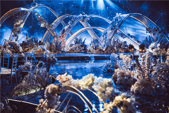 与其许诺千万个美好的未来,不如给一个踏实的现在,而我们终会碰上一个人,眉间是银河,眼中有星辰,那就是你眼里的全世界。将这种纯净星海的灵感注入到婚礼当中较浪漫不过,层叠起伏花艺拱门造型,与半空水滴状星海吊饰,脚下蓝色花丛搭配,再折射到镜面,银河星海,亦梦亦幻。迎宾区也极具创意,半封闭螺旋状花艺镂空美感空灵,幻化出一副蓝色海洋的传说。