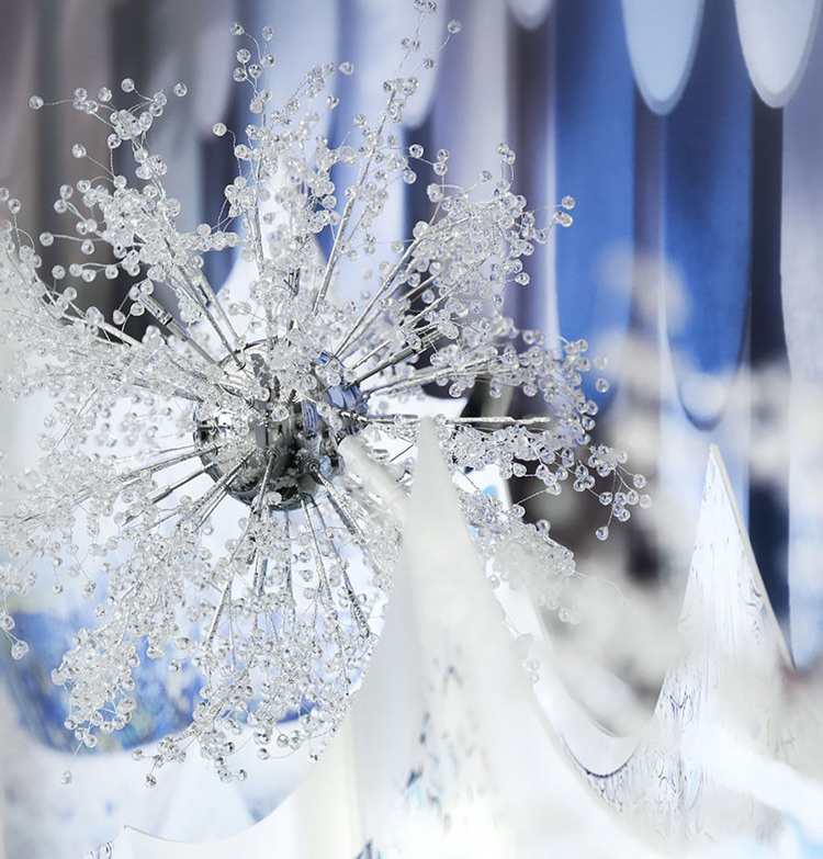 4.新娘在白蓝色主题婚礼中需要更好的打造水晶般的妆容,闪亮元素的是不适合在这里采用的,皮肤质量不太好的新娘,要在内眼角用闪粉或白色珠光眼影进行提亮,增加剔透感。