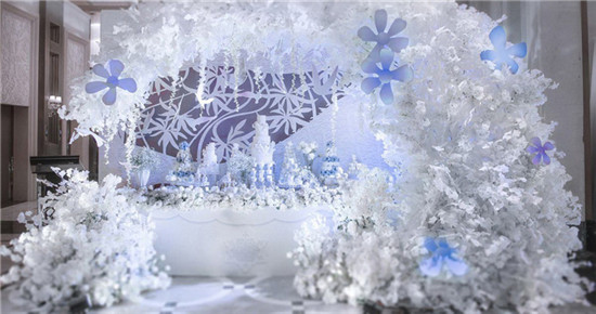 我们渴望纯洁的爱情,渴望这一生只爱一个人,设计师用干净的视觉体验,白净的雕花装饰及唯美质感的线帘为新人打造了一场空灵唯美的白色婚礼。