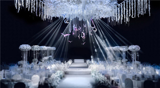 主舞台圆形花团吊顶中垂下错落的线帘,飞鸟在丝线和光晕中翩翩起舞,在莹白的灯光下,梦幻唯美;仪式通道亦是纯白一片,闪着圣洁的光芒。