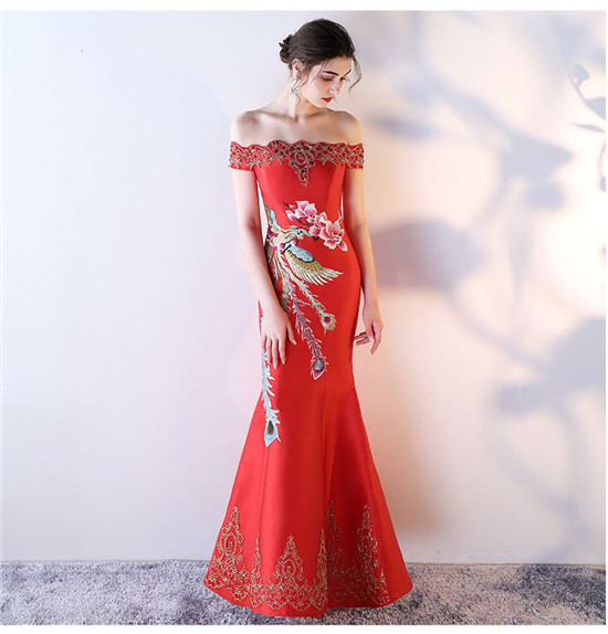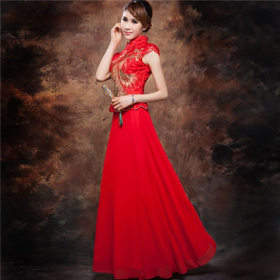 2.旗袍婚纱领口与新娘的脸型:气质高雅而脖子较长的新娘非常适合穿高领旗袍。脖子较短的新娘适合穿无领的。