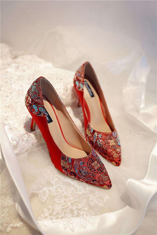 大红色象征着喜庆,很适合在婚礼那一天穿。新娘要穿旗袍,不仅要考虑婚鞋的颜色,还有就是鞋子的材料和光泽。婚鞋较好婚礼过后,还能在生活中穿,这样比较实用。