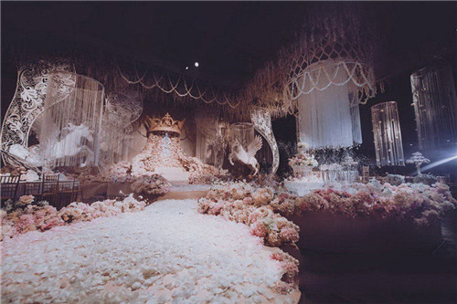给她一场浪漫婚礼,圆她一场公主梦。主舞台采用了空中藤花垂吊和大型圆环垂吊造型,拉伸出现场的空间层次感与高度,打造出一座公主的宫殿,让现场更为宽敞梦幻。再用女生钟爱的蕾丝元素去雕琢属于他们爱的宫殿,那里有宫廷建筑中美轮美奂的喷水池,错落有致的花瓣点缀不规则的圆形T台,像是通往宫殿的幸福之路,还有那一伸手就能触碰的爬满宫殿的整片藤花,瀑布般垂下的线帘,宛若从未有人打扰过的世外桃源。