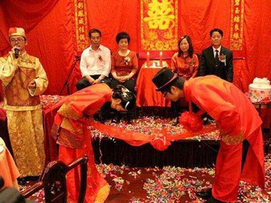 当夫妻拜堂时,主持人口中高声念诵祝词,有的地方要穿插吃子孙饽饽、喝和合汤等。