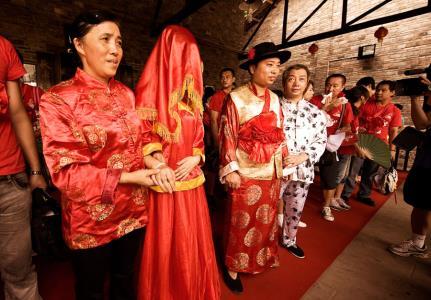 22、闹房:在近代,这是新婚夫妇在婚礼之夜在新房接受亲友祝贺、嬉闹的仪节,民间有“新婚三日无大小”,“闹喜闹喜,越闹越喜”的说法。各地的“闹房”有不同的方式、方法,闹的程度也有文雅和粗俗之分,有时闹过了头,往往给主宾双方带来尴尬和不快,但因为它给婚礼增加了热烈的气氛,所以后来的婚礼中往往少不了这一节目。