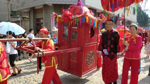 起轿:轿夫起轿,两面开道锣鼓喧天,前往新郎家。