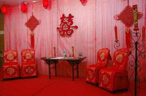 中国传统的婚礼仪式,是喜悦的典礼,所以称为庆典。结婚典礼全部使用体现吉祥的婚礼物品来装饰。如张贴大红喜字,给新娘遮上红盖头,穿上大红袄,新郎胸前佩戴大红绸等等。这些红色的吉祥物品不但给婚礼带来喜庆的气氛,同时也暗示着新婚夫妇婚后的日子会越过越红火。