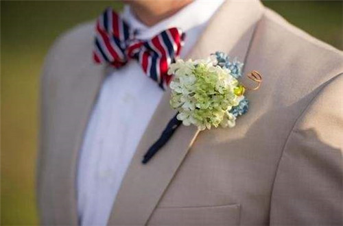 新郎在挑选胸花的原料和颜色时也要把领带的颜色思考进入,挑选领带上的某种颜色作为主色调会令全体搭配对比谐调、舒服。假如是花样较杂的领带,胸花可以简略一点,哪怕只要一朵花也会很超卓。一朵花再加上一些搭配的满天星类的小花就够了。胸花本是一个装饰品,假如喧宾夺主成为视觉的焦点真实不是一个正确的行为。