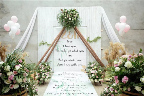背景布置要先确认面积,再选择好用是普通布幔还是KT板,也可以在仪式区选择LED屏,但这是比较贵的项目,预算不多的新人呢请慎重。
