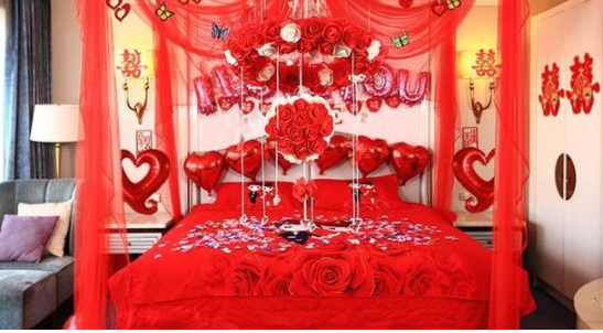 1.装饰婚房的时候要以床为中心,不仅能床品要选择大红色突显喜庆氛围。整体布置以粉色或者紫色风格为主是较为合适的啦,旁边用气球、婚庆所用的雪纱以及各种风格的纸花去装饰,能够让婚房塑造出梦幻般的效果。