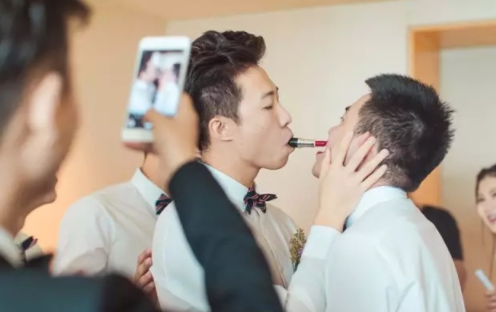 6.基情传递,新郎伴郎按顺序一字排开,用嘴或脸传递扑克、筷子、香蕉、海苔、气球等道具。在规定时间内完成传递,画面太美,激情四溢。