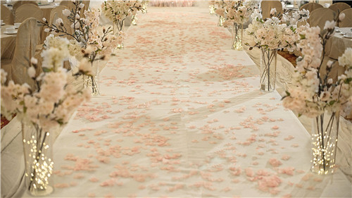 甜美浪漫的婚礼怎么少得了花瓣地毯的设计,在仪式通道洒满花瓣看着婚礼慢慢步入婚礼场地是很浪漫的,可以用白色的玫瑰花瓣,或者粉色的都是可以的,把花瓣洒在仪式通道的地毯上面,高档纯白色地毯打底,瓶型路引,清透精致,粉色花瓣飘散的艺术写实,白粉花枝雀跃跳动,韩式立柱摆放花束造型囤绕成方形交接台更契合温馨色调,梦幻高档。