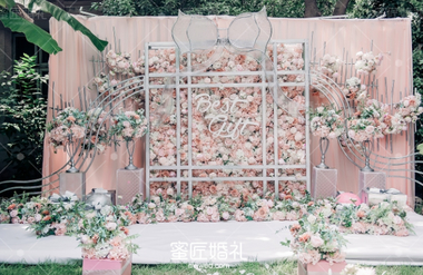 我曾生活在狭小的空间,眼前但是一方单薄宇宙,后来有幸识你,得见浩大江山,乾坤万景。因循大气的欧式婚礼,放眼望去,一片绯色。主舞台蕾丝造型的景片参差有致,叠加摆放,大型金色镂空树叶造型铁艺交叉在花丛与蕾丝间,团体造型像极了精灵的古堡。穹顶上是粉色的吊顶,布幔与花艺交叠,水晶线帘下垂着根根白色羽毛,与主舞台的色彩形成对比,又巧妙的融为一体。