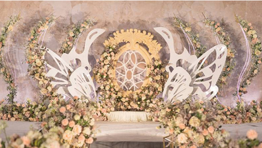 这个婚礼主题是根据西方国家的仪式,精心打造的,具有欧式神话之称的颜色。整个婚礼颜色为香槟色,香槟代表是尊贵的象征,所以整个婚礼看起来是多么的尊贵神圣,酒香入色,沉浸在这个时刻中。
