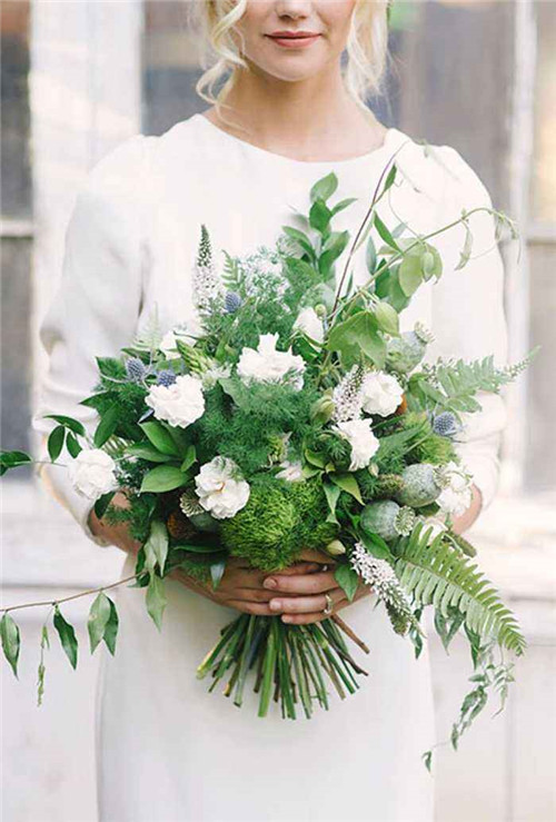 婚纱白色的偏多,所以缤纷色的手捧花做为道具和点缀会起到更大的作用,如果想突出圣洁的感觉,花多全部选用白的的,也一定要多用绿叶陪衬。