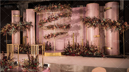 新人们。整个婚礼现场是用油画卷轴铭刻誓言用作主舞台的背景,然后运用了上千枝浪漫花门以及蝴蝶造型,瞬间就给人一种翩然而至的蝴蝶倾听爱的承诺。婚礼现场的色调优雅,而且又饱满精致,有着镂空的花架,随心灵动哦。