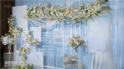 晨曦一款十分自然清新的婚礼主题,婚礼现场的主色调是蓝色的,非常的舒服清新,而且搭配白色的布幔,微风吹来,随风而动,一下子就提升了层次感和空间美感了哦。而且婚礼现成的那些立体造型,与整体十分的协调,非常的精致,大方简约又有设计感,轻奢之美一下子就有了。