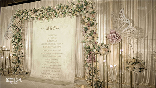 一场浪漫的法式风格的优雅婚礼,非常适合喜欢优雅浪漫的婚礼现场的 新人们。整个婚礼现场是用油画卷轴铭刻誓言用作主舞台的背景,然后运用了上千枝浪漫花门以及蝴蝶造型,瞬间就给人一种翩然而至的蝴蝶倾听爱的承诺。婚礼现场的色调优雅,而且又饱满精致,有着镂空的花架,随心灵动哦。