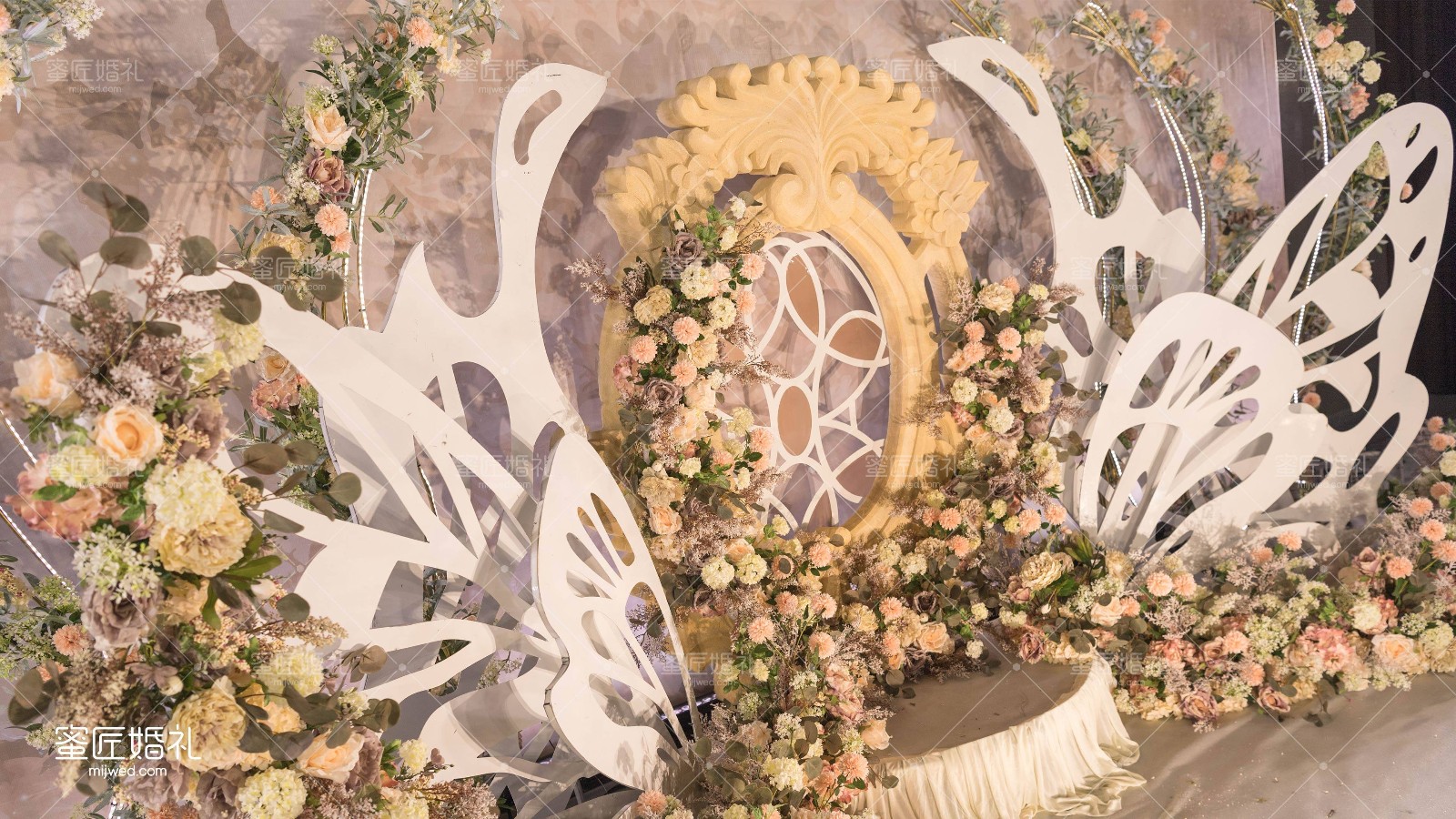 2.时光馥:大型欧式相框泡雕造型,搭配超大型定制金属蝶翼,映衬着浅香槟的底色,酒未入喉,便已醉在这幸福梦幻的氛围中。